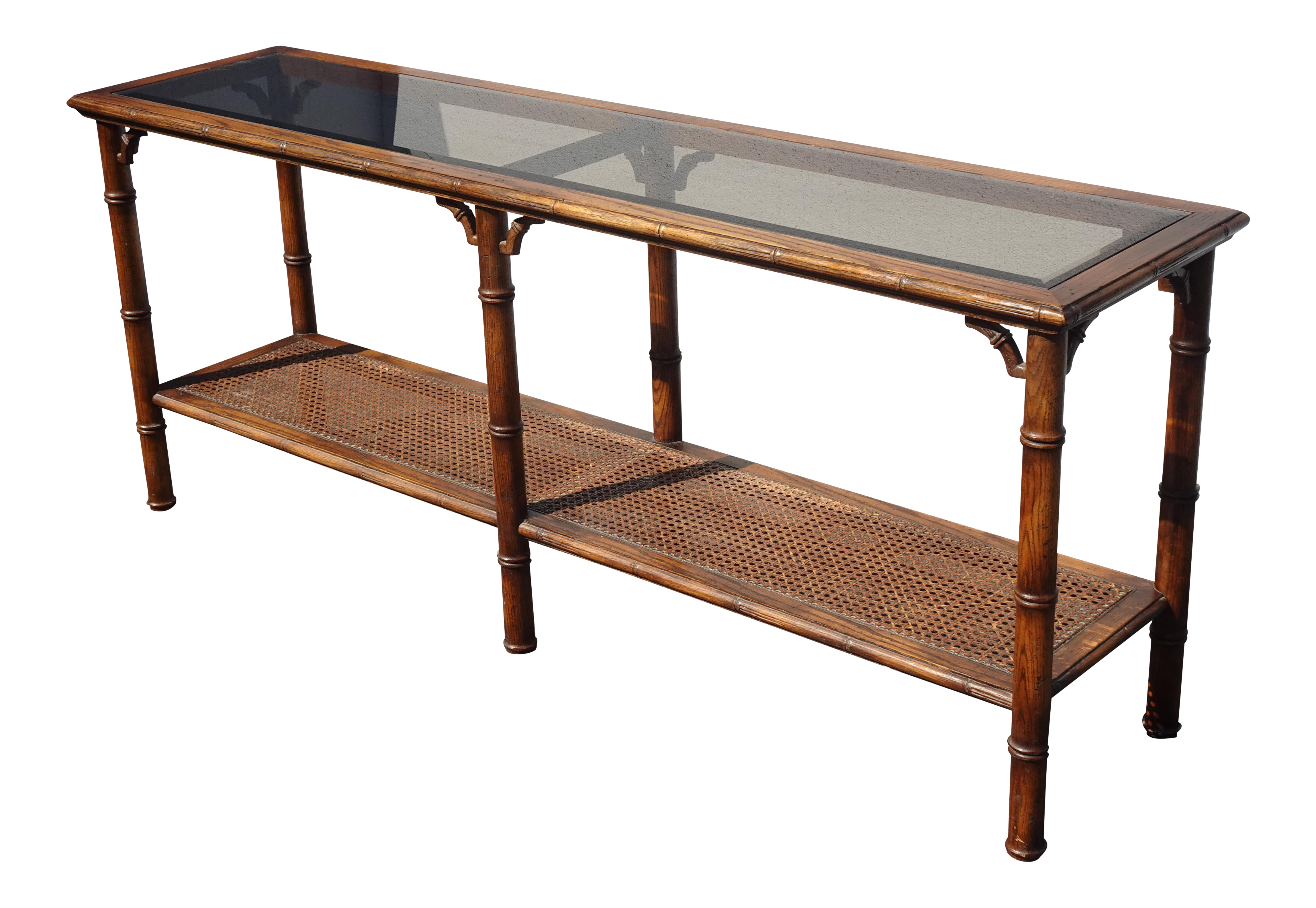 Vintage French Country Two Tier Brown Oak Side Table W Cane Shelf