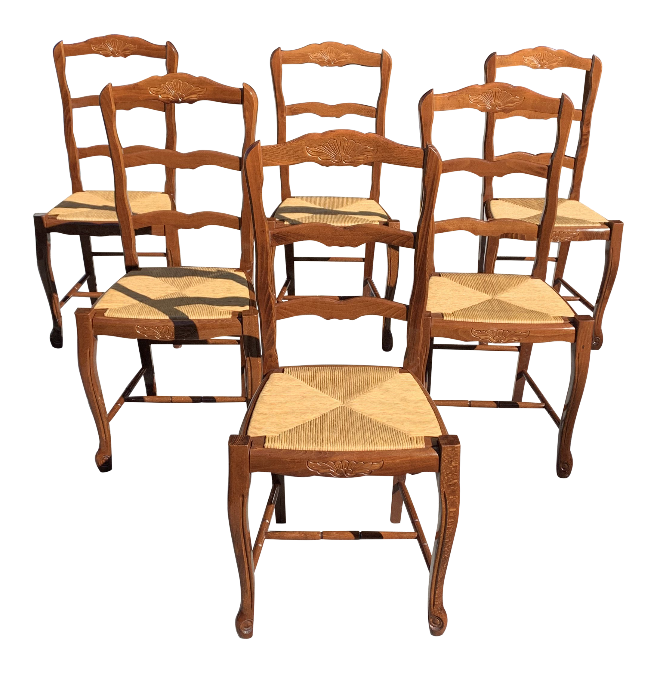 1910s Vintage French Country Rush Seat Walnut Dining Chairs Set